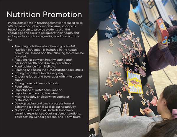 - Nutrition Promotion: PA will participate in activities that reinforce health and emphasize the school commitment to a healthy school nutrition environment by: