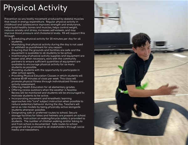 - School Sponsored Events: PA will incorporate wellness components including physical activity and healthy eating opportunities.